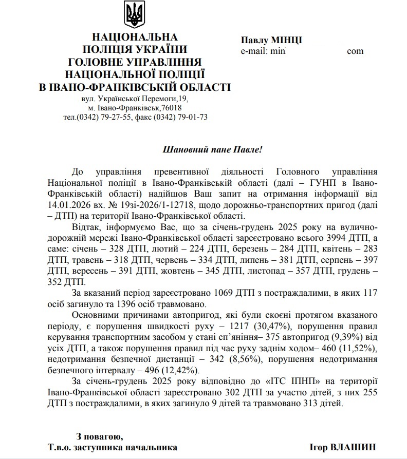 Ми отримали офіційні дані від Головного управління Національної поліції в Івано-Франківській області за підписом т.в.о заступника начальника Ігоря Влашина за 2025 рік:
