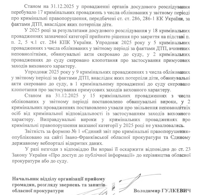Фіртка отримала офіційні дані від Івано-Франківської обласної прокуратури про кримінальні провадження ти вироки за 2025 рік, які стосуються ДТП.
