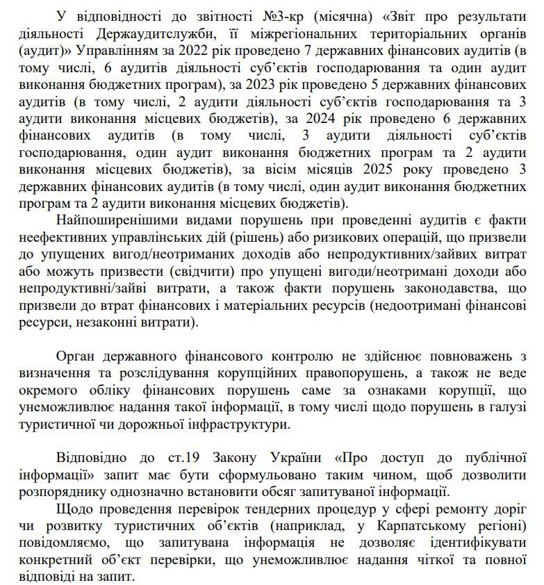 Фіртка звернулася з офіційним запитом до Управління Західного офісу Держаудитслужби в Івано-Франківській області. У вересні 2025 року начальник Богдан Грицак надав детальний документ на шістьох сторінках, де описано ключові аспекти роботи органу: від державних фінансових аудитів до виявлення порушень у використанні бюджетних коштів.