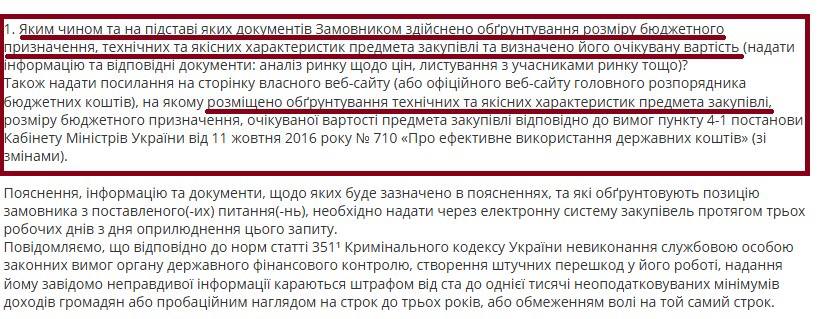 А далі вони надіслали офіційний лист про виявлені порушення в тендері Служби відновлення, що відсутні відомості про технічні, якісні та кількісні характеристики об'єкта закупівлі. Закон вимагає детального опису товарів, робіт чи послуг, але, за словами аудиторів, цього не зробили в конкурсі на ті "скромні" 236 мільйонів гривень.