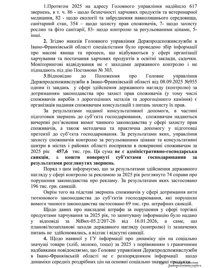 Отримана у січні 2026 року відповідь Головного управління Держпродспоживслужби в Івано-Франківській області виявилася досить стислою. У ній зазначалося, що через дію мораторію на планові та позапланові перевірки під час воєнного стану (згідно з Постановою Кабінету Міністрів України №303 від 13 березня 2022 року) жодних таких заходів щодо дотримання законодавства про ціноутворення та захист прав споживачів у магазинах, супермаркетах, на ринках чи оптових базах не проводилося.