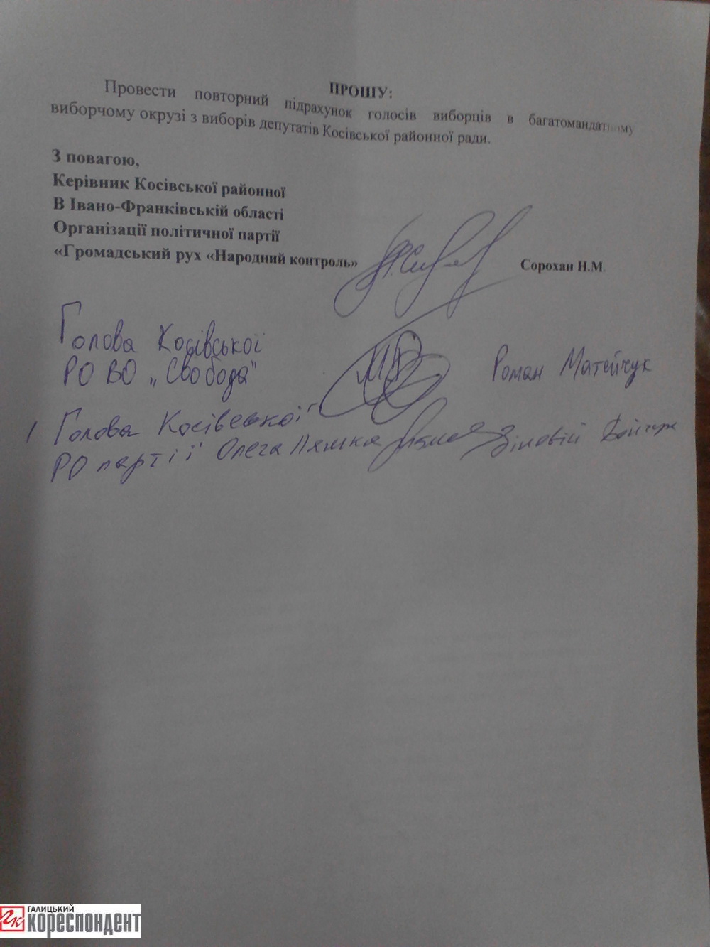 З відповідними скаргами у Косівську РВК звернулася районна організації «УКРОПа», Радикальної партії Олега Ляшка та «Народного контролю».
