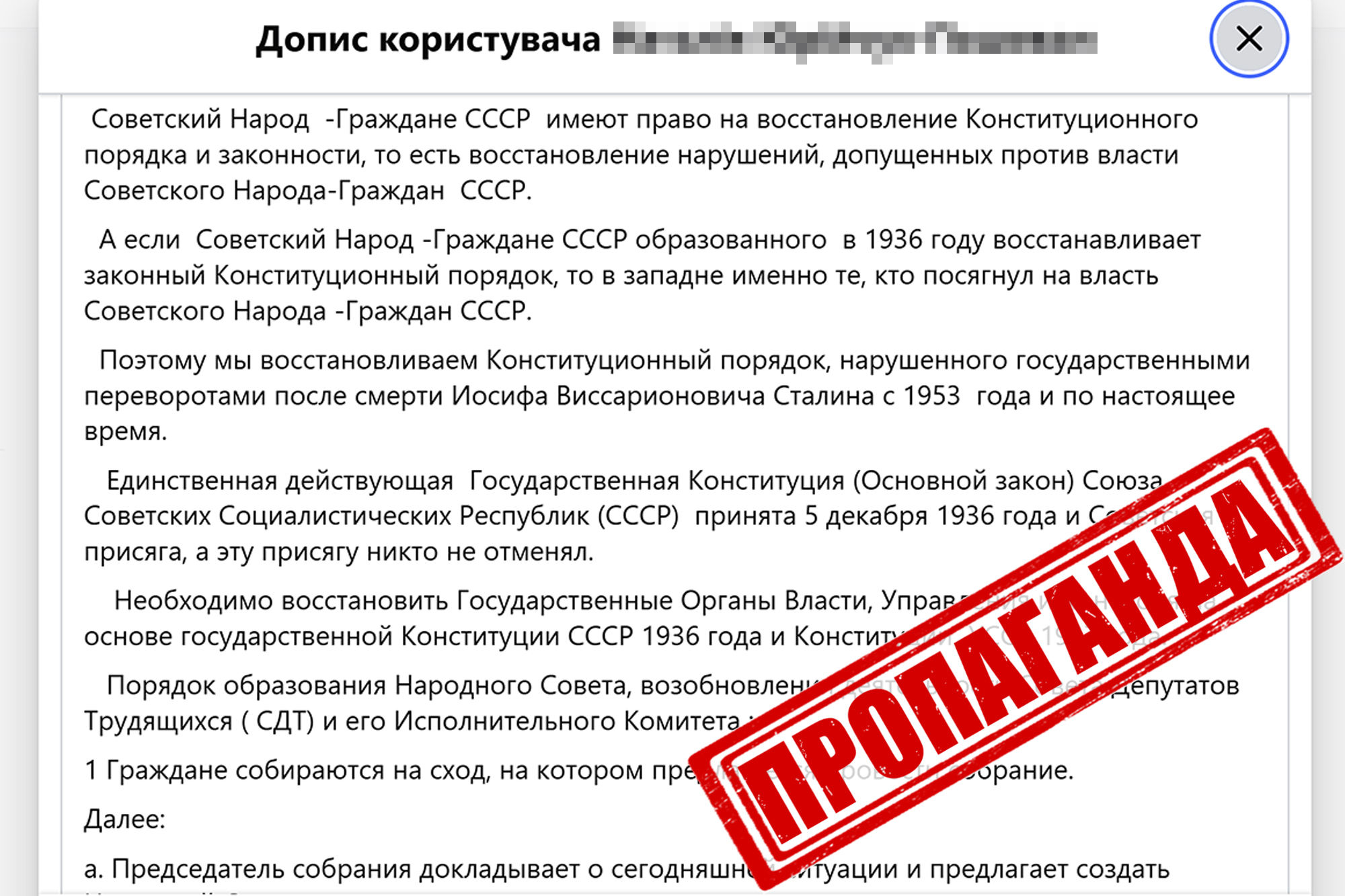 Контент, який публікувала фігурантка, містив детальні плани відновлення срср та української рср із поверненням до сталінської конституції 1936 року, тогочасних органів влади включно з «народними судами» та трибуналами, а також «міжнародні» контакти з так званими «днр», «лнр» і невизнаним Придністров’ям.