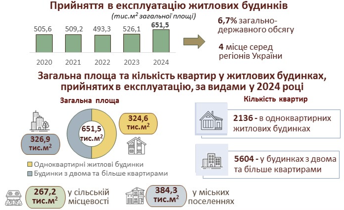 Більше як половину нового житла збудували у містах — 384,3 тисячі квадратних метрів, решту 267,2 тисячі — у сільській місцевості.
