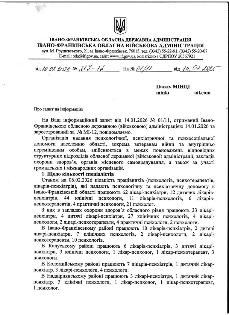 Щоб отримати детальну картину про стан психологічної допомоги в Івано-Франківській області, ми звернулися з офіційним запитом до Івано-Франківської обласної державної адміністрації.