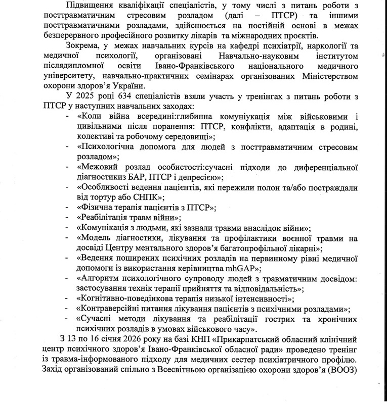 У 2025 році 634 фахівці пройшли тренінги з тем як "Психологічна допомога для людей з ПТСР", "Реабілітація травм війни", "Комунікація з людьми, які зазнали травми" та інші. З 13 по 16 січня 2026 року в Прикарпатському центрі психічного здоров'я провели тренінг з травма-інформованого підходу за підтримки ВООЗ, JICA та Івано-Франківського національного медичного університету.