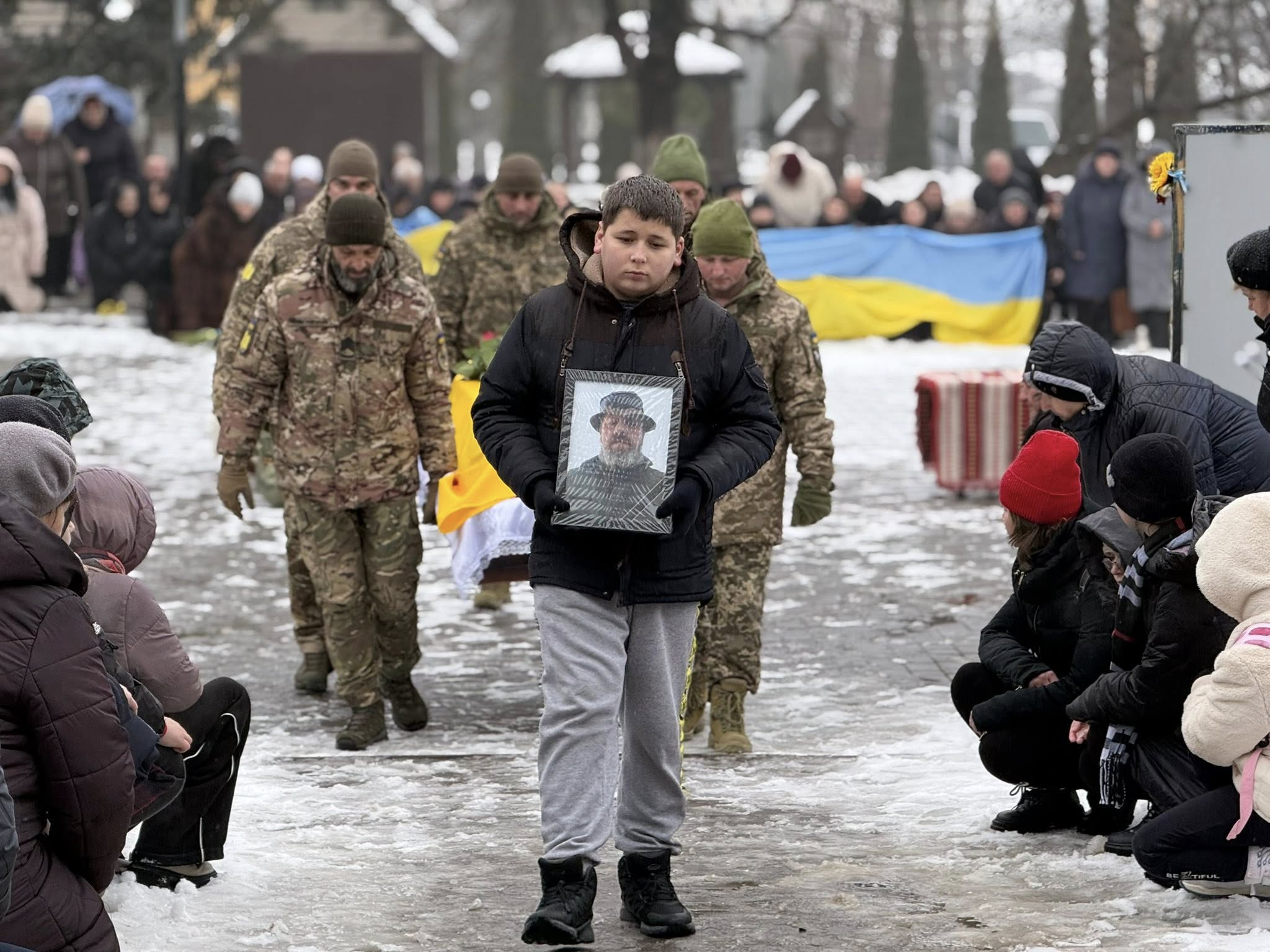 Для цього використовують фотографії підлітка з Івано-Франківщини, зроблені під час церемоній прощання з загиблими військовими.