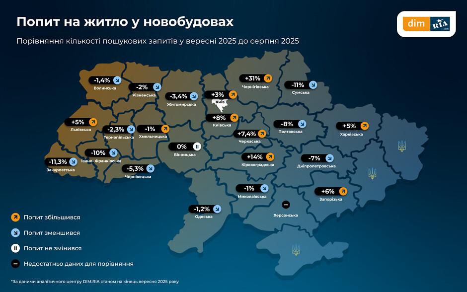 Попит на нові квартири у вересні залишався нестабільним. Найбільше він зріс у Чернігівській (+31%) та Кіровоградській (+14%) областях.