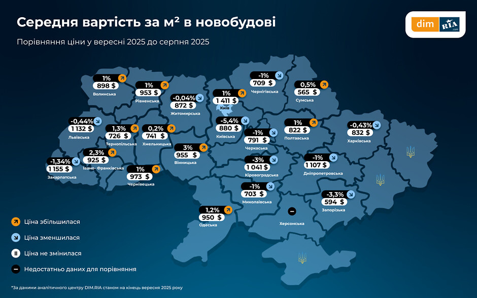 Вартість квадратного метра у більшості регіонів продовжує зростати. Найдорожчими залишаються новобудови Києва — $1 411/м². Найнижчі ціни зафіксували у прифронтових регіонах, зокрема на Сумщині та у Запорізькій області.