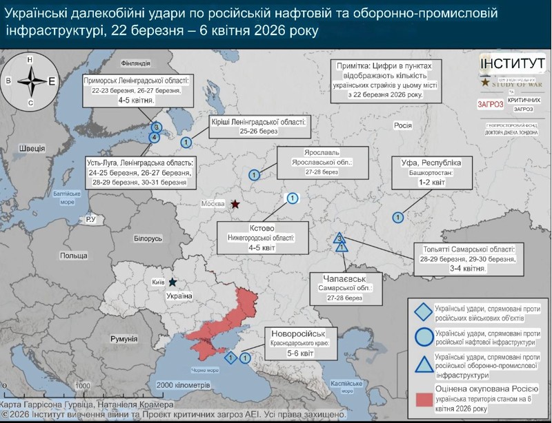 Інститут також цитує повідомлення Financial Times 6 квітня про те, що нещодавні українські удари по порту експорту нафти Приморськ призвели до спалення нафти на суму 200 мільйонів доларів.