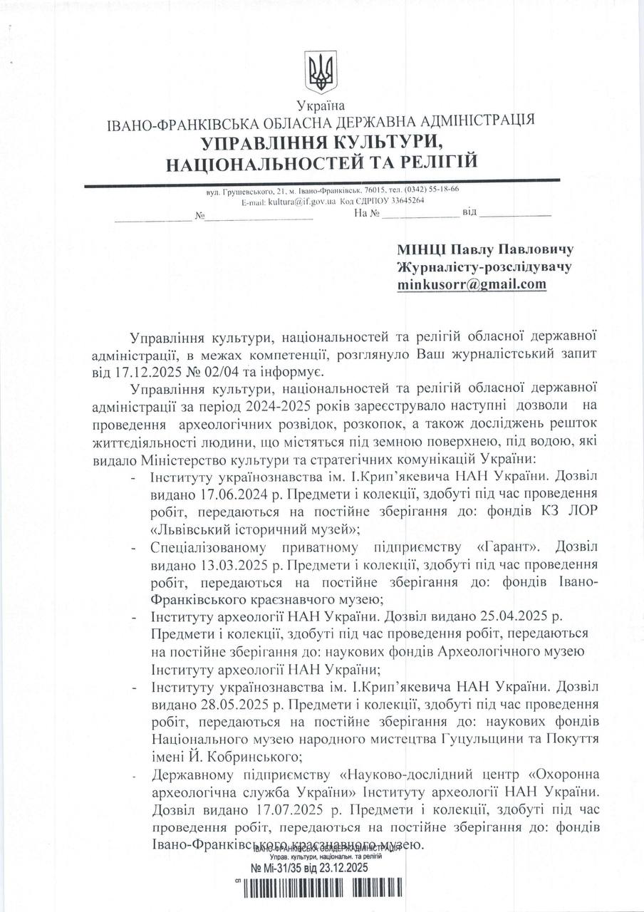 Фіртка надіслала запит до Управління культури, національностей та релігій Івано-Франківської ОДА щодо археологічних розвідок і розкопок у 2024–2025 роках. У відповіді від 23 грудня 2025 року в.о. начальника Мирослава Корнелюк повідомила, що Міністерство культури та стратегічних комунікацій України видало п’ять дозволів на такі роботи.