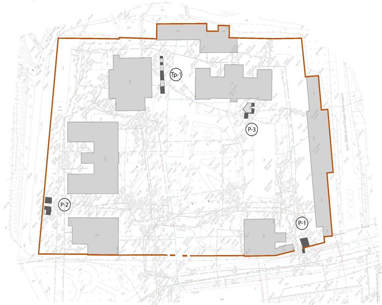 Розташування закладених стаціонарних розкопів (Р. 1-3) і траншеї (Тр. 1) та схематичне позначення виявлених архітектурних та археологічних об’єктів
