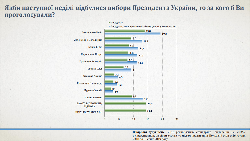 За лідера "Опозиційної платформи "За життя" Юрія Бойка — 11,6%, президента Петра Порошенка — 11,3%, лідера партії "Громадянська позиція" Анатолія Гриценка — 11,1%, лідера Радикальної партії Олега Ляшка — 9,1 %, мера Львова Андрія Садового — 4,5%, народного депутата Олександра Шевченка — 4,2% і главу партії "Наші" Євгенія Мураєва — 2,9%.