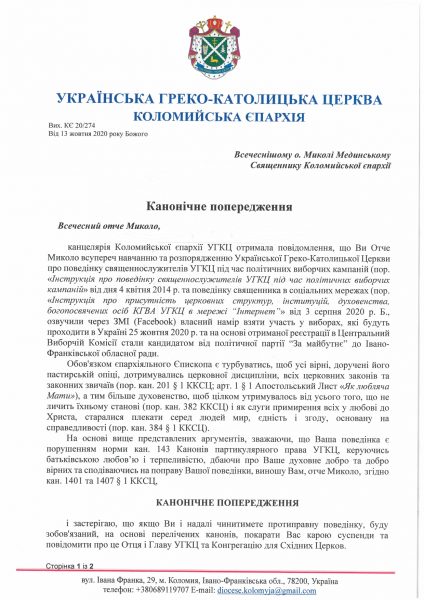 У канонічному попередженні зазначається, що священник Коломийської єпархії Микола Мединський порушив інструкцію про поведінку священнослужителів під час виборчих кампаній та інструкцію поведінки священника в соціальній мережі, коли повідомив на своїй сторінці у Facebook, що балотується до Івано-Франківської обласної ради від партії «За майбутнє».