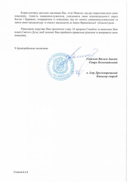 «І застерігаю, що якщо Ви і надалі чинитимете протиправну поведінку, буду зобов’язаний покарати Вас карою суспенди (йому забороняється виконувати усі священнодіяння – авт.) та повідомити про це главу УГКЦ та Конгрегацію для Східних Церков», - йдеться у листі Василя Івасюка до Миколи Мединського.
