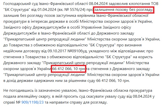 Прокуратура вимагає визнати договір від 9.10.2017 недійсним і стягнути всю суму — 66 412 066,10 грн — з ТОВ «БК Структура» на користь державного закладу з подальшим зарахуванням коштів у дохід держави.