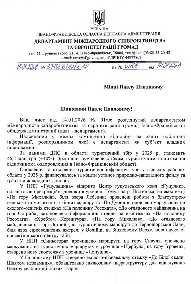 Фіртка направила журналістський запит до Івано-Франківської облдержадміністрації щодо розвитку туристичної галузі у 2025 році. У відповідь Олександр Зрайко, директор Департаменту міжнародного співробітництва та євроінтеграції громад, надав детальну інформацію про надходження туристичного збору, ключові проєкти та досягнення в національних парках. Ось основні відомості з офіційної відповіді: