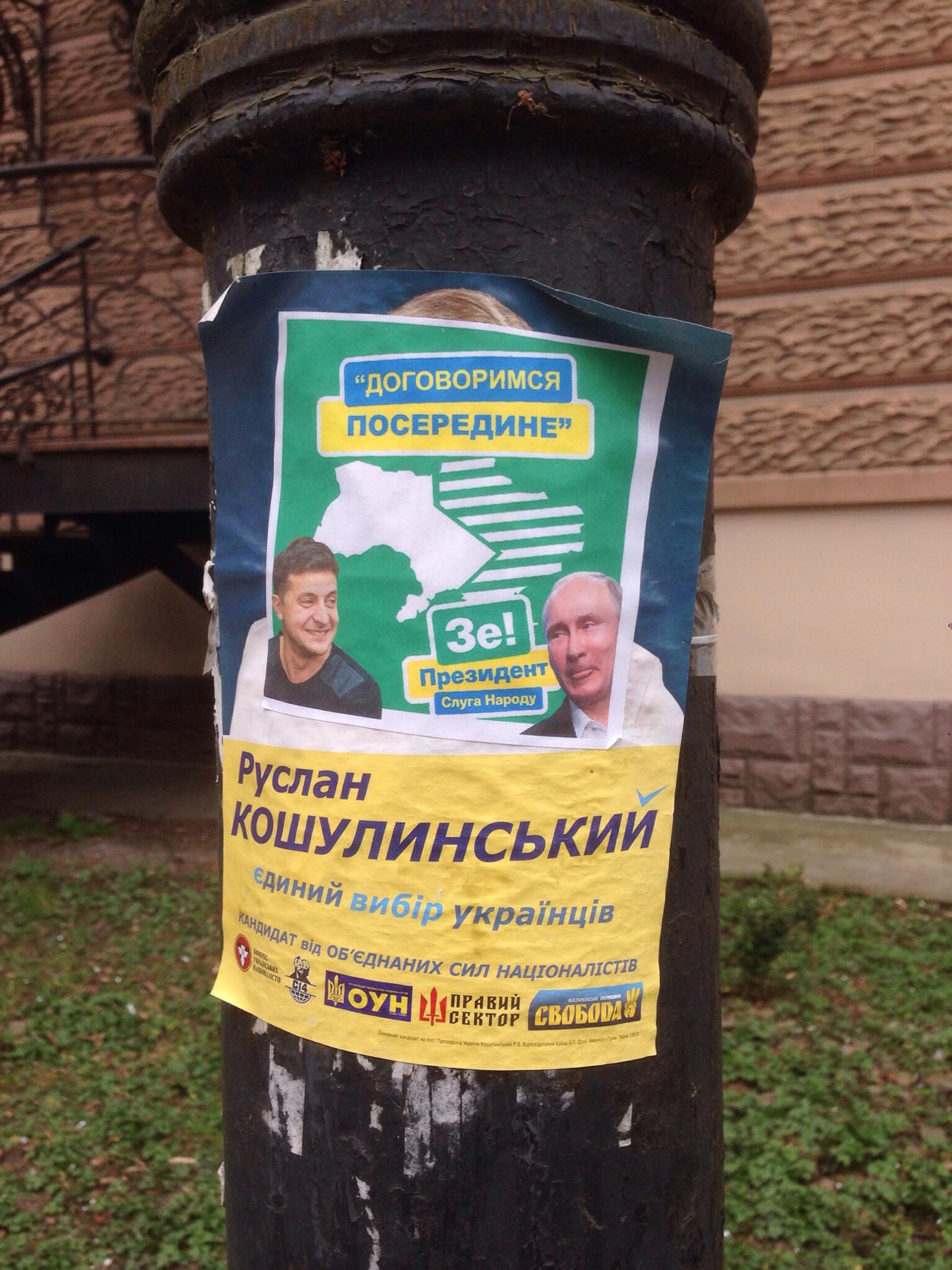 На листівках із написом «Договоримся посередине» Зе Президент Слуга Народу» зображений кандидат Володимир Зеленський та Президент РФ Володимир Путін, які ділять навпіл карту України.