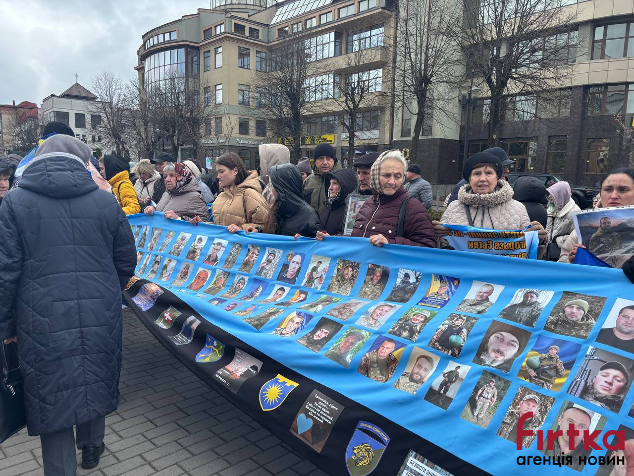 Громадські спілки родин зниклих безвісти організували банери та прапори зі своїми рідними, яких вони очікують.