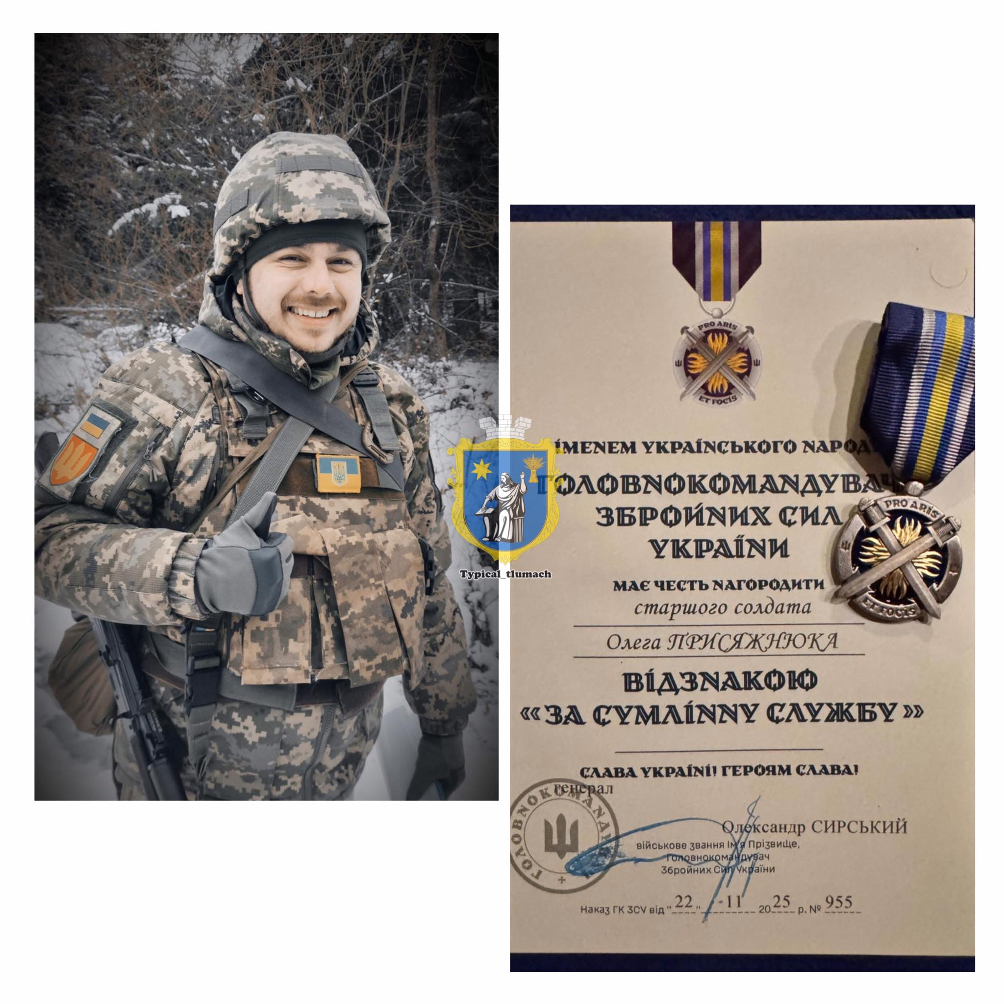 «Наказом Головнокомандувача Збройних Сил України нагороджений відзнакою «За сумлінну службу» Олег Присяжнюк.