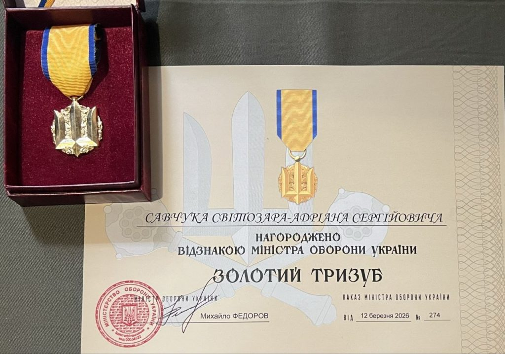 Так, за високі показники у бойовій підготовці, вірність військовій присязі, особистий внесок у зміцнення обороноздатності держави та зразкове виконання службових обов'язків Міністр оборони України Михайло Федоров нагородив Світозара-Адріана Савчука медаллю «Золотий тризуб».