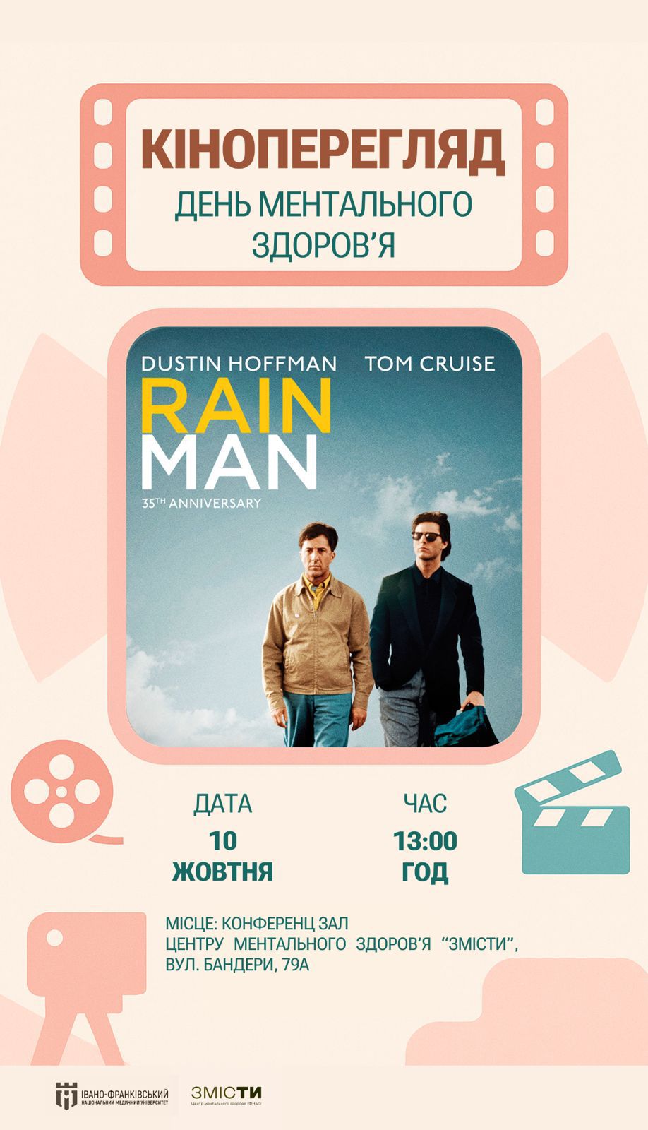 О 13:00 у конференц-залі Центру ментального здоров’я «ЗмісТи» (вул. Бандери, 79а, колишній коледж «Граната») відбудеться атмосферний кіноперегляд фільму “Людина дощу” (“Rain Man”).