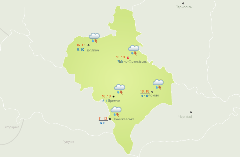 В Івано-Франківську +16-18 тепла, грозовий дощ. Вітер дме з північно-заходу.