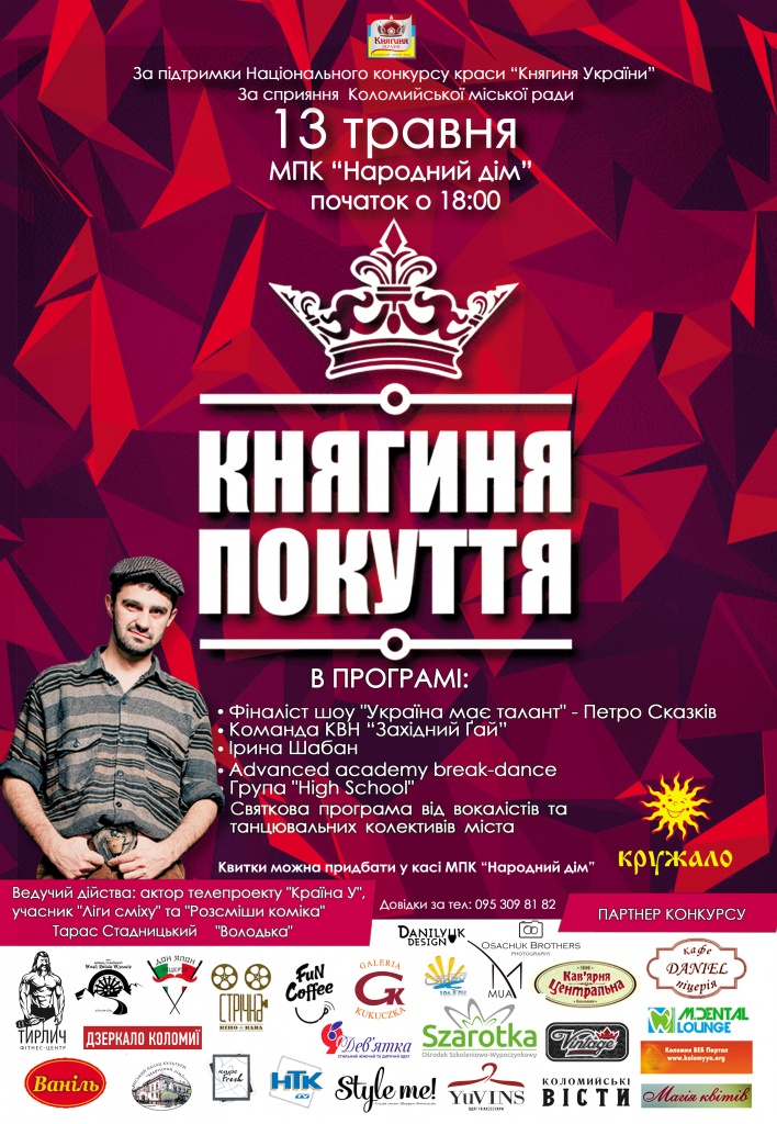13 травня в міському палаці культури «Народний дім» 14 красунь, віком від 16 до 19 років, боротимуться за титул Княгині Покуття та за можливість представляти покутський край на мега фіналі Національного конкурсу краси «Княгиня України», передають Коломийські Вісти.