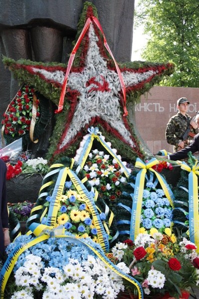 У той час, як ВО "Свобода" чекала прикарпатських комуністів на Вічевому майдані і на панахиду так і не потрапила (припустимо, що вони туди і не поспішали, оскільки вважають 9 травня Днем жалоби, а не Перемоги), представники КПУ вільно розгорнули свою партійну символіку та Прапори Перемоги на площі біля Вічного вогню під час урочистостей.
