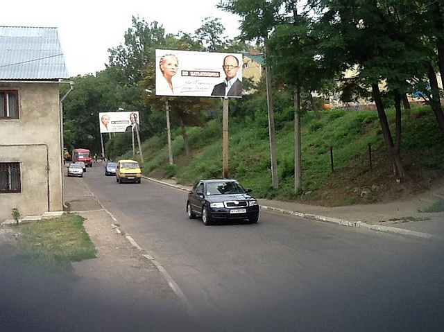 На фотографії зображена одна з вулиць Коломиї з одностороннім рухом транспорту. При цьому агітаційні щити з портретами Арсенія Яценюка і Юлії Тимошенко розміщені так, що водії автомобілів їх бачити не можуть.