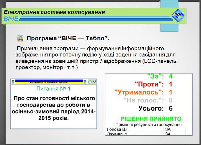 «Віче» – дітище хмельницького підприємства «Електросистема». Система «Віче» складається з комп’ютера голови ради, великого табло, на якому відображається оперативна інформація про хід голосування та роботу ради і персональних пультів депутатів, які ще й обладнані мікрофонами.