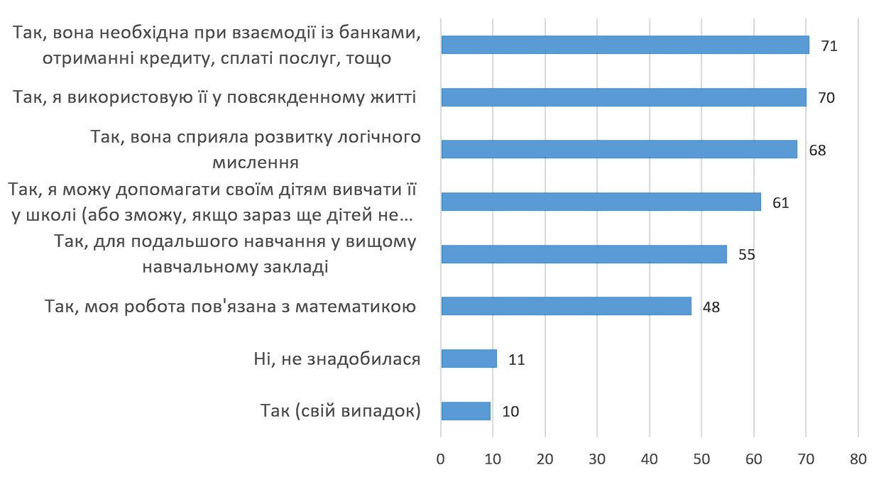 Так, три головні випадки застосування математики — при взаємодії із банками, отриманні кредиту, сплаті послуг тощо (71%), використання у повсякденному житті (70%) і вплив на мислення (68% респондентів вважають, що математика сприяла розвитку їхнього логічного мислення), різниця між цими трьома пунктами незначуща.