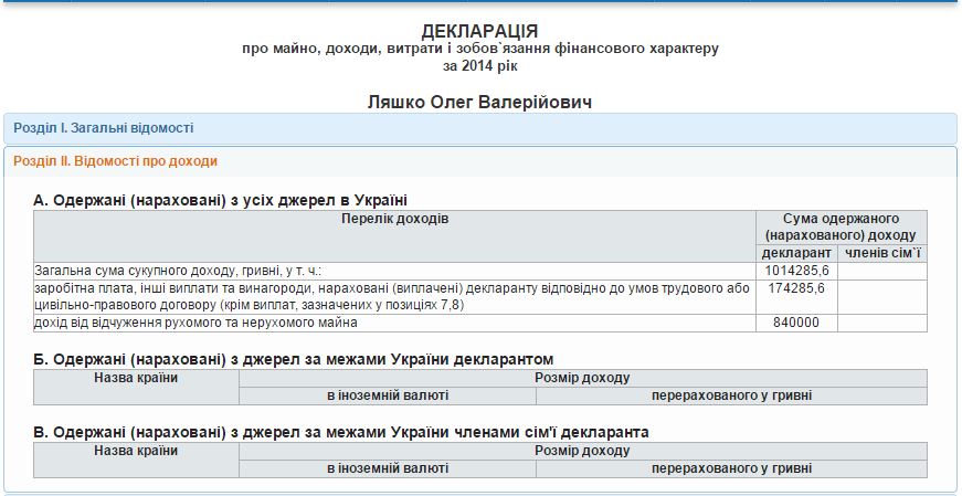174 тисячі із цієї суми Ляшко отримав як зарплату, а ще 840 тисяч від продажу майна.