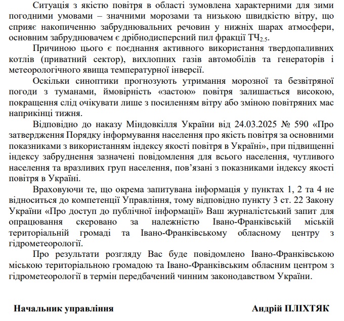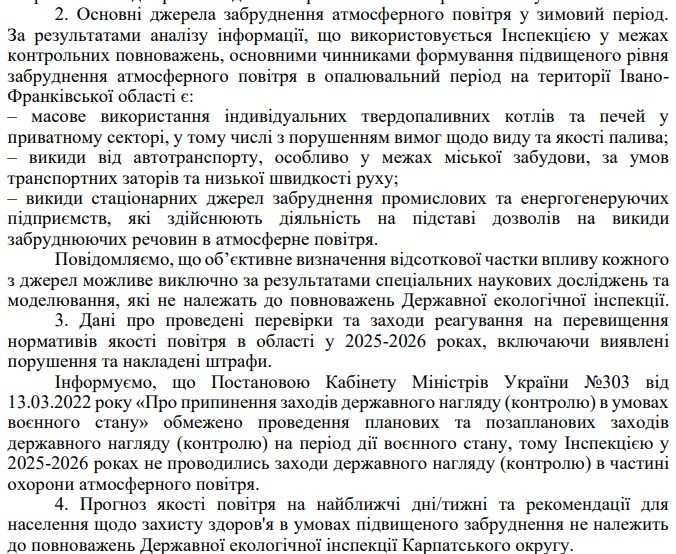 Від Державної екологічної інспекції Карпатського округу (лист за підписом начальника Сергія Гаєвського) ми дізналися, що підвищення AQI (показник загального забруднення повітря) до 150-175 у грудні 2025 року має сезонний характер і пов’язане з діяльністю людей та несприятливими погодними умовами.