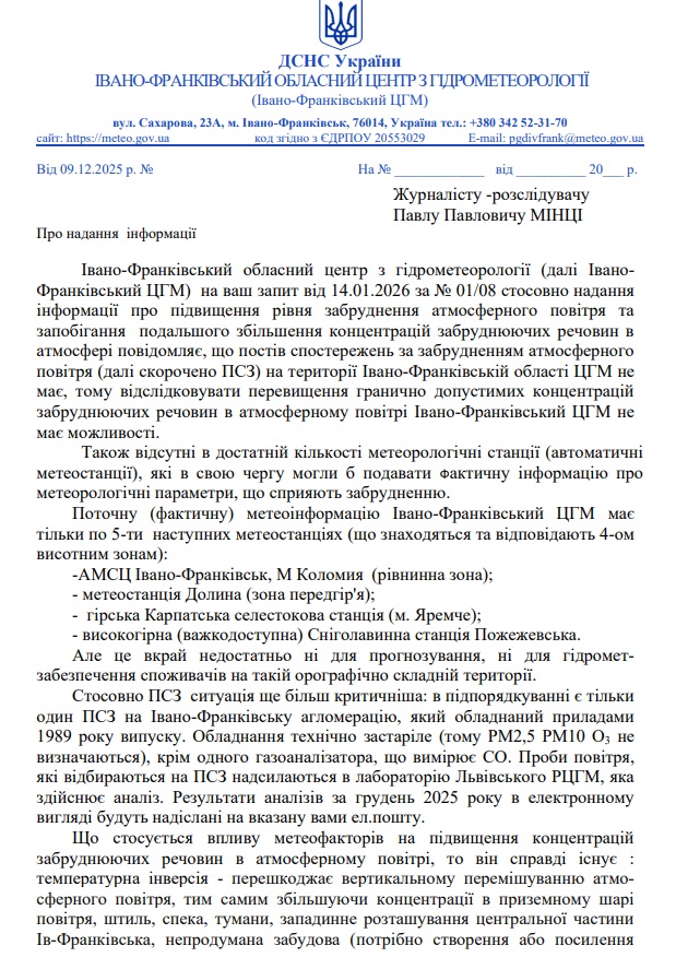 Управління екології та природних ресурсів Івано-Франківської обласної державної адміністрації надало конкретні дані моніторингу якості повітря в Івано-Франківську (за підписом начальника Андрія Пліхтяка) за період з 1 грудня 2025 до 20 січня 2026 року — щодо основних забруднювачах: діоксид азоту, діоксид сірки, оксид вуглецю, пил ТЧ2.5 і ТЧ10, озон.