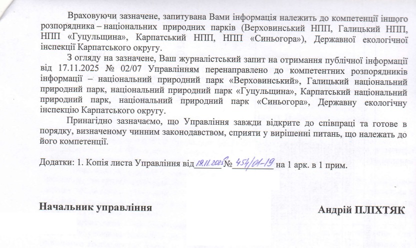 Управління надіслало відповідь з підписом начальника Андрія Пліхтяка. У листі сказано, що воно не є розпорядником потрібної інформації. Тому запит офіційно переслали до п’яти національних парків області: