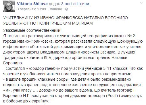 Так само з другим постом: в той час, коли Шилова написала, що вчительку звільняють, вона була в школі, спілкувалася з лікарями «швидкої допомоги». Черговий адміністратор дізнавався у медиків, як ситуація, ті сказали, що тиск в нормі, ситуація стабільна».