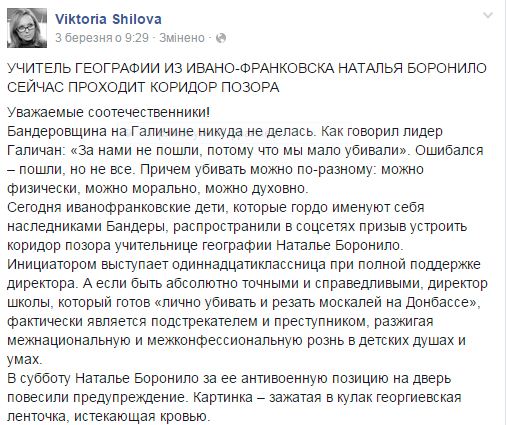 «Пост про те, що вчителька проходить коридор ганьби з’явився в інтернеті у Шилової в 9.20, за 45 хвилин до акції. «Коридор» діти влаштували о 10.15. Ми, вчителі, ще самі не знали в 9.20 про те, що буде "коридор ганьби", - каже Ольга Гапяк. На дверях у кабінеті Наталії Боронило 11-класники причепили табличку "Ні сепаратизму!".