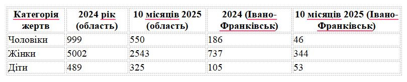 Згідно з наданими даними, у 2024 році до поліції Івано-Франківської області надійшло 6538 заяв та повідомлень про правопорушення та події, пов'язані з домашнім насильством. За 10 місяців 2025 року цей показник склав 3 289 звернень. У місті Івано-Франківську ситуація така: 1545 заяв у 2024 році проти 653 за 10 місяців 2025-го.
