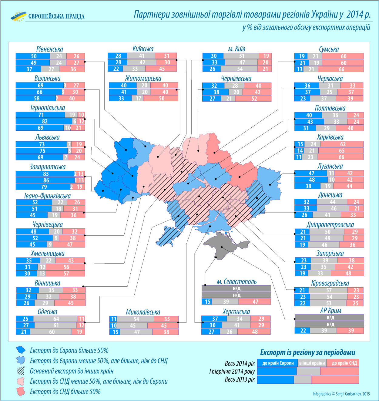 Все це не могло не відобразитися і на регіональній структурі українського експорту. Якщо за підсумками 2013 року експорт до Європи перевищував поставки до країн СНД лише в Києві і семи областях країни, то за рік кількість таких областей зросла на шість.
