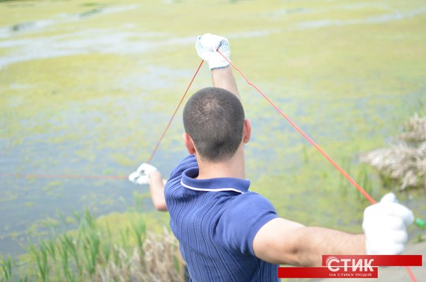 Далі активісти змайстрували конструкцію, котра складалась з імпровізованих залізних грабель та каната, на якому закріпили ці граблі. Вони поділились на дві групи - по одній на кожен берег, після чого тягнули граблі від берега до берега, і на них чіплялось чимало водоростей.