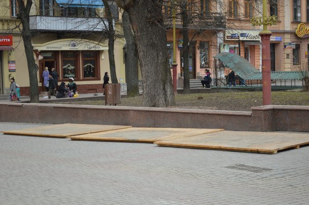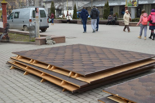 На Вічевому майдані в Івано-Франківську розпочали монтаж ярмаркових будиночків до Великодня.
