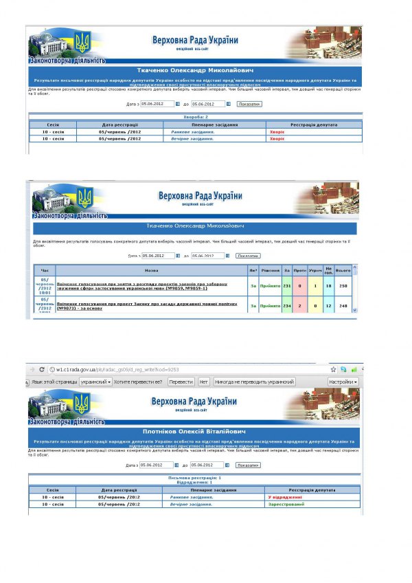 А навпроти прізвища колишнього спікера парламенту з комуністичної фракції – Ткаченка О. М. у письмовій реєстрації зазначено, що у день голосування за мовний закон він "ХВОРІЄ", хоча його голос враховано.