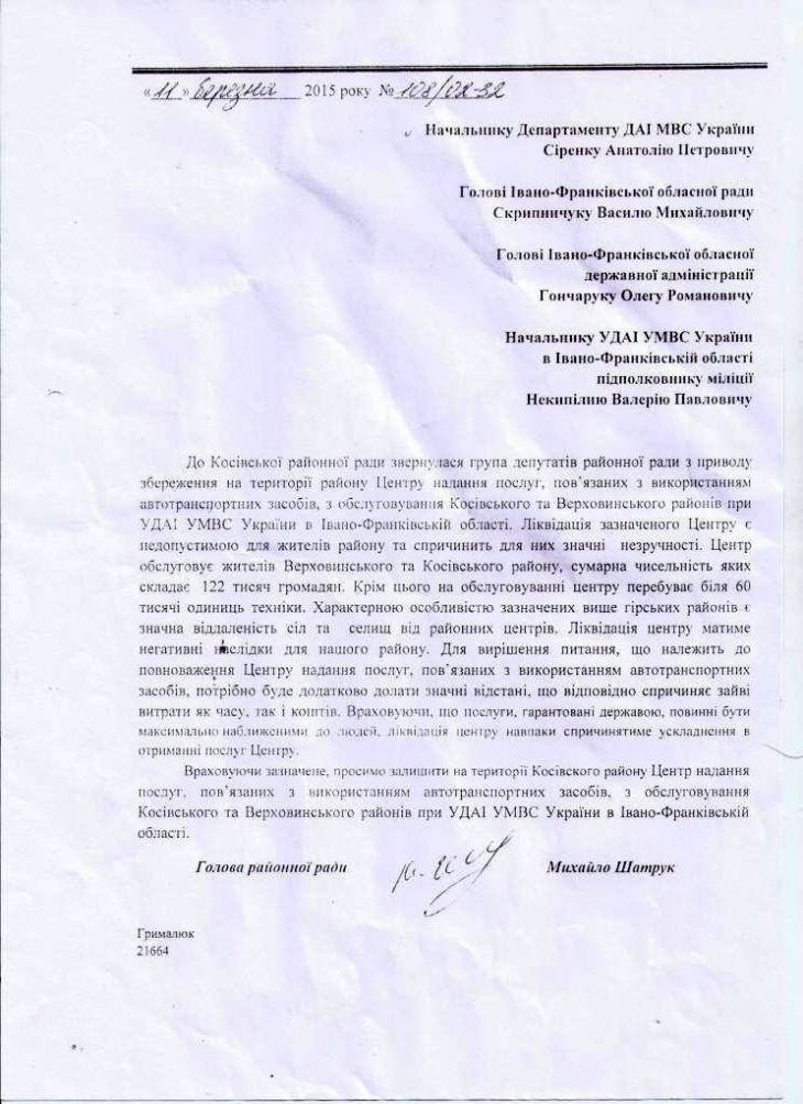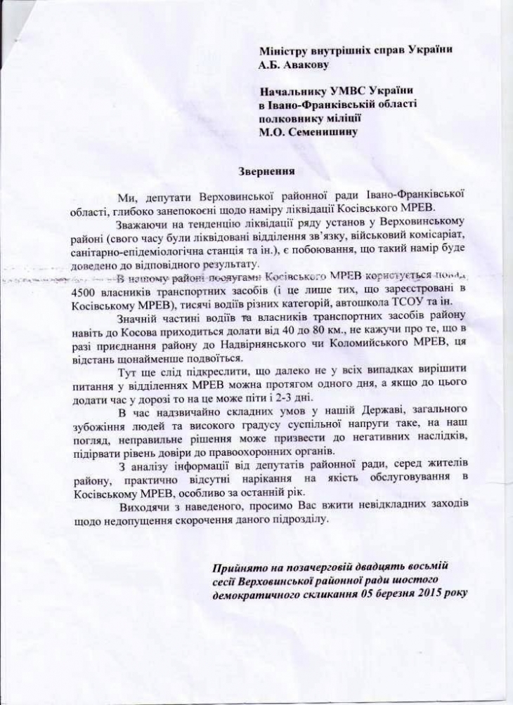 "У нашому районі послугами Косівського МРЕВ користуються понад 4500 власників транспортних засобів, тисячі водіїв різних категорій, автошкола..." – пишуть депутати Верховинської райради, зауважуючи, що в разі приєднання району до Коломийського чи Надвірнянського МРЕВ людям доведеться долати іноді й понад сотню кілометрів за документами.
