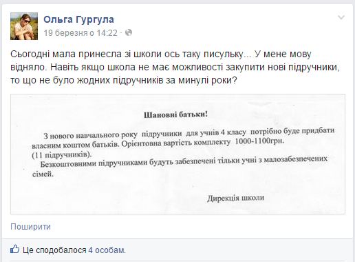 «Шановні батьки! З нового навчального року підручники для 4 класу потрібно буде придбати коштом батьків. Орієнтовна вартість комплекту – 1000-1100 гривень (11 підручників)». Безкоштовними підручниками будуть забезпечені тільки учні з малозабезпечених сімей. Дирекція школи», – йдеться у повідомленні.