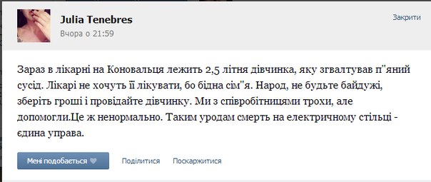 «Зараз в лікарні на Коновальця лежить 2,5 літня дівчинка, яку згвалтував п"яний сусід. Лікарі не хочуть її лікувати, бо бідна сім"я. Народ, не будьте байдужі, зберіть гроші і провідайте дівчинку. Ми з співробітницями трохи, але допомогли. Це ж ненормально...», - пише схвильована дівчина.