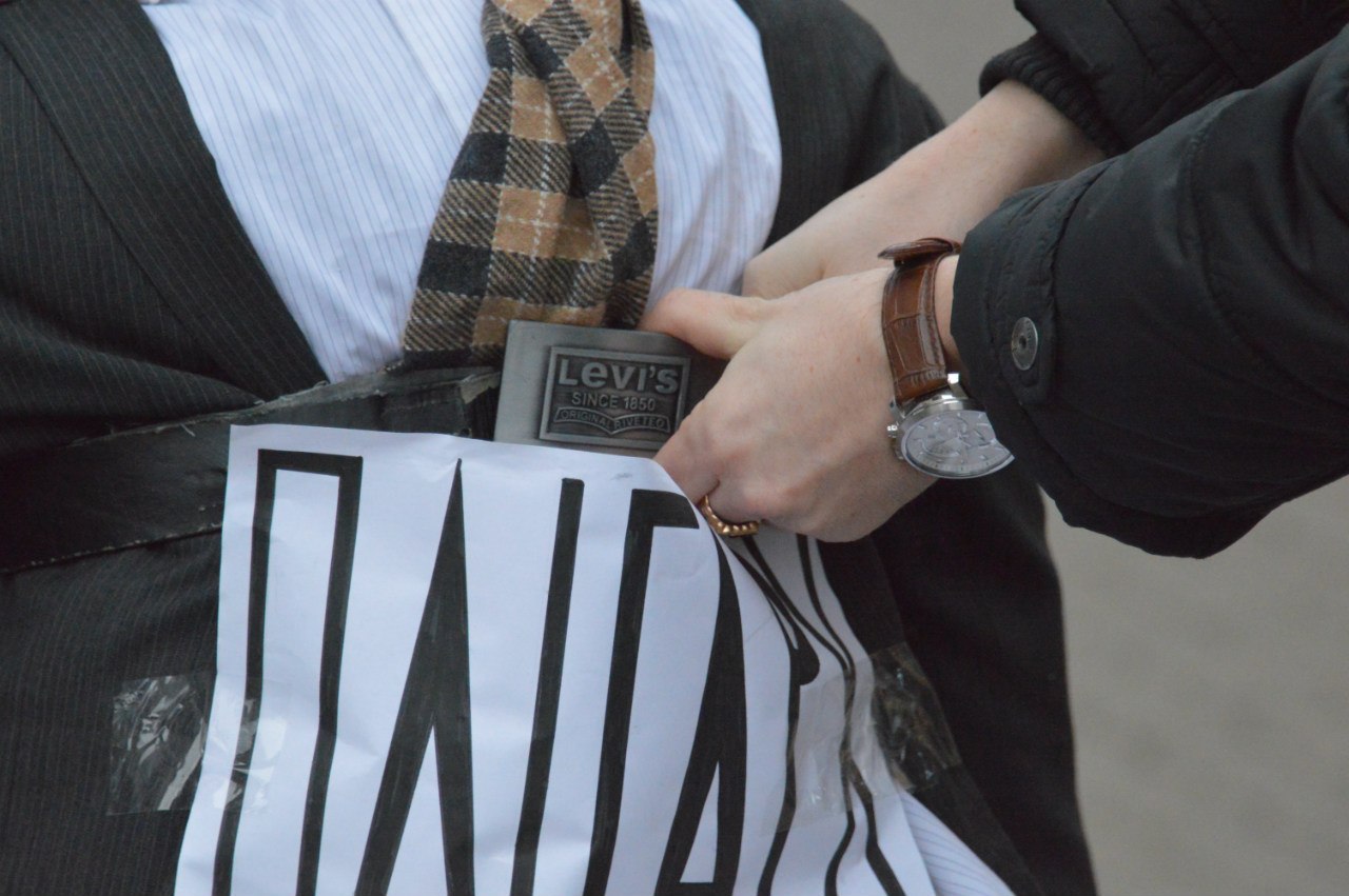 В центрі міста активісти однієї з партій влаштували театралізований флешмоб "Затягни пасок олігарху", в рамках якого кожен бажаючий міг затягнути пасок на пузі ляльки-олігарха.