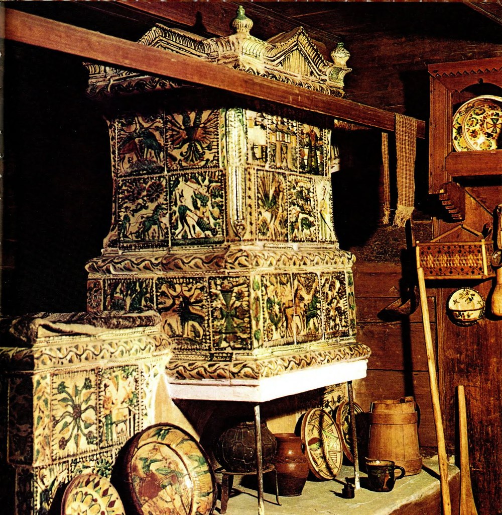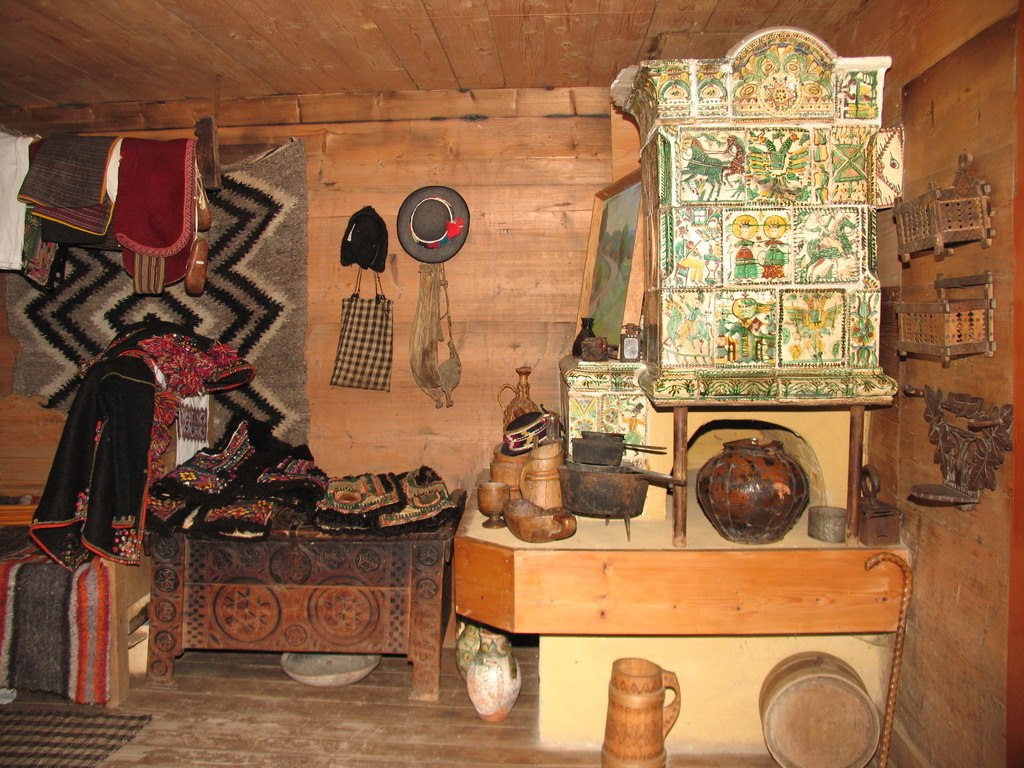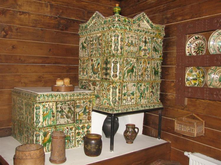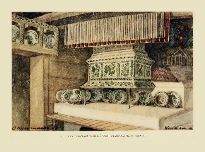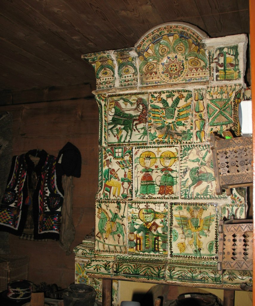 У печі послідовність викладених кахель підпорядкована певному ритмові, що підкреслюється своєрідним завершенням з фронтонів і кутовими прикрасами над комином. За словами мистецтвознавця Катерини Каркадим, заввідділу Коломийського музею народного мистецтва, розписані кахлі обов’язково ставилися зверху донизу згідно зі значимістю сюжетів. Перший ряд згори, безумовно, найважливіший. Він вважався оберегом, до нього зверталися з різними проханнями. Обабіч розташовувалися кахлі з релігійним сюжетом, соціальної чи державної важливості, скажімо, із зображенням дзвонів, австрійського двоголового орла. Праворуч і ліворуч — зображення побутових сцен: орач з люлькою, мисливці, що вирушили на полювання... І ось вам, до речі, приклад гуцульського гумору — один мисливець везе іншого на тачці, а той, котрого везуть, тим часом стріляє у якусь птаху.