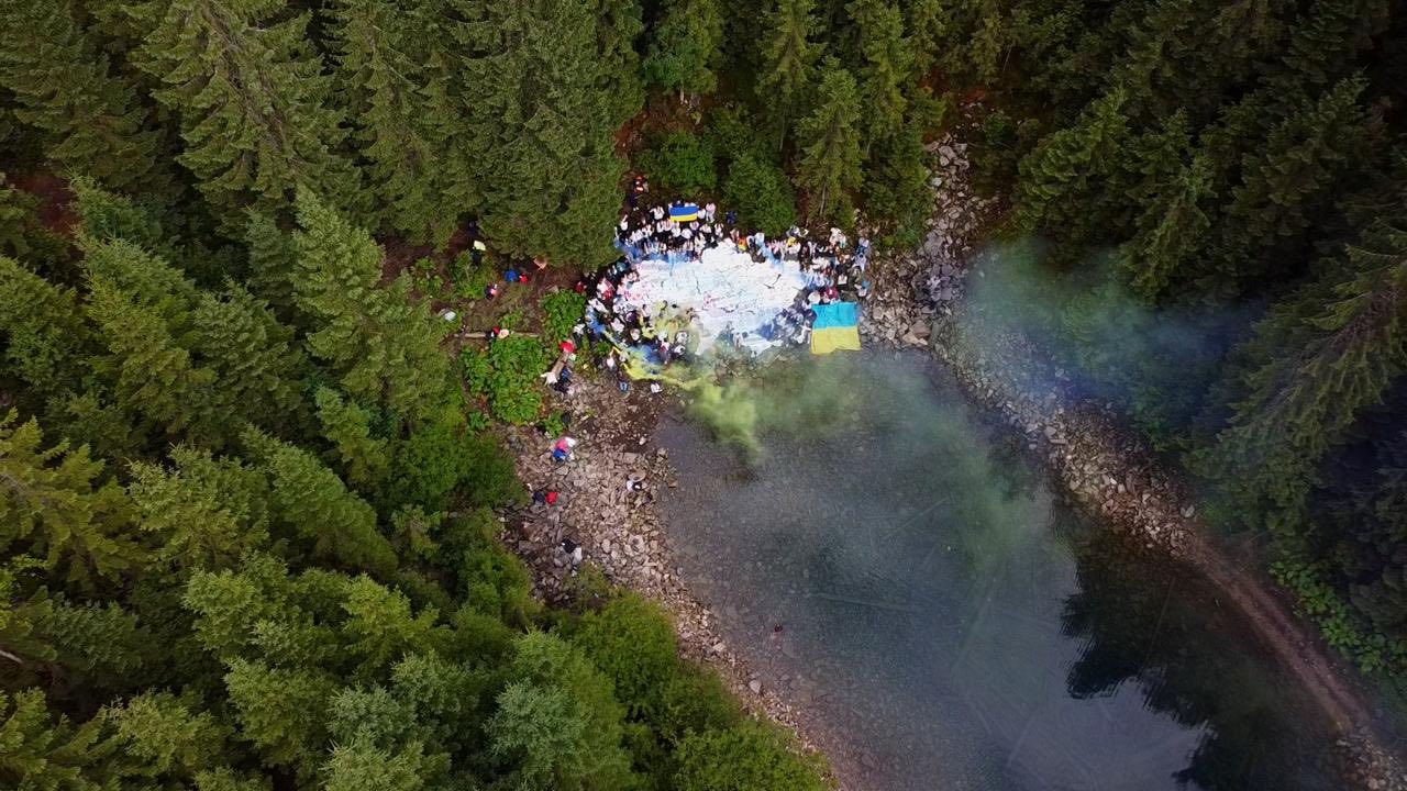 Діти зібрали гігантську мапу України на березі карпатського озера Росохан.