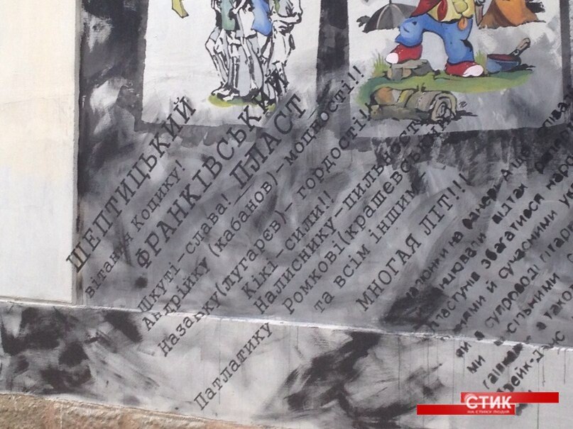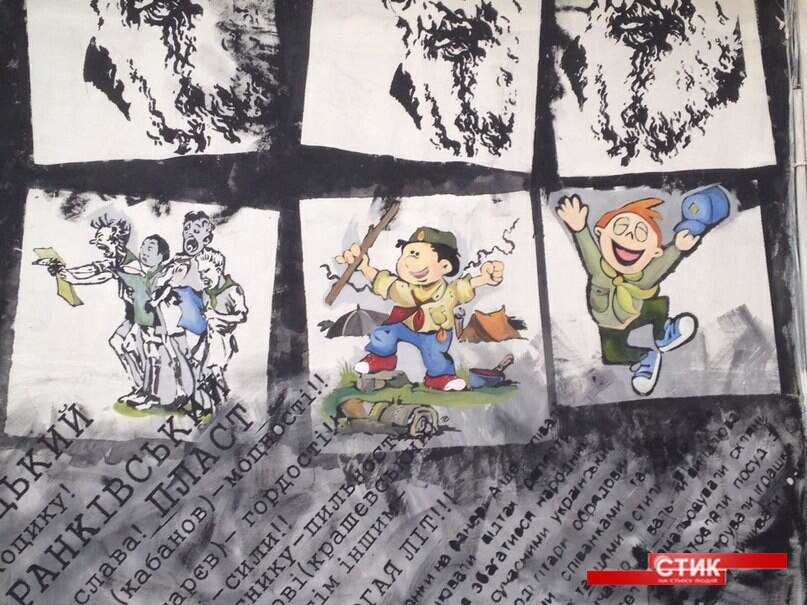 Окрім малюнку, внизу сітни є надписи. Ідея цих надписів належить художнику, який розмалював стіну - Яремі Стецику. На ній закарбовано псевдо тих пластунів з Прикарпаття, які були або зараз зараз воюють на Сході за цілісність України.